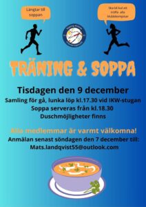 Kom ihåg att vi har första soppkvällen 9 december i IKW-stugan. Alla är välkomna. Anmälan senast 7 december till Macke: mats.landqvist55@outlook.com. Soppa serveras från k 18:30